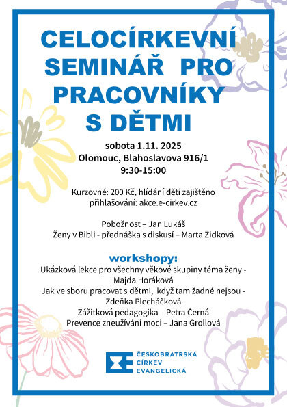 V sobotu 1. listopadu 2025 se ve Farním sboru ČCE v Olomouci uskuteční celocírkevní seminář pro pracovníky s dětmi. Podrobné informace naleznete v pozvánce.